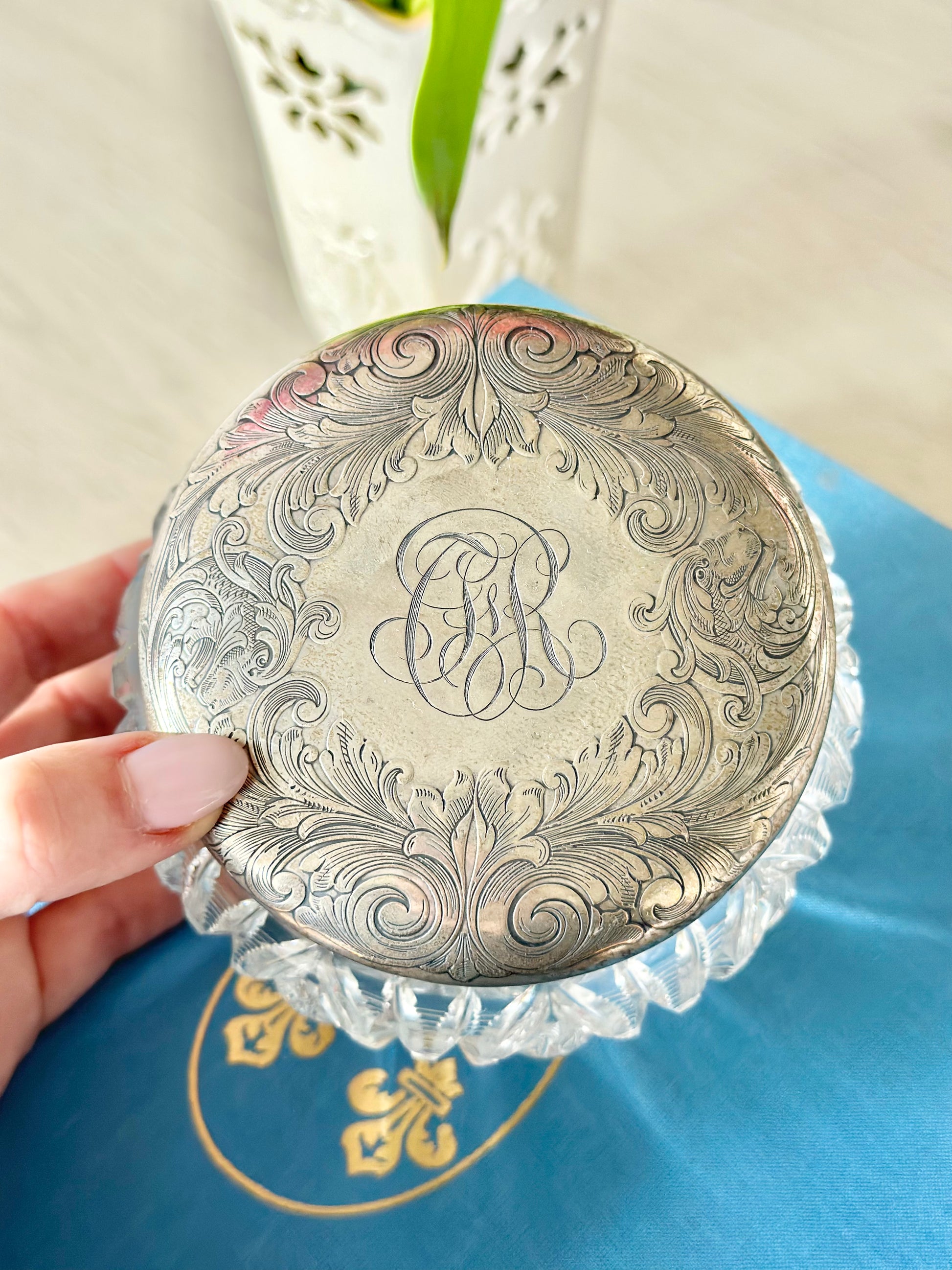 Cut Crystal Vanity Jar with Engraved Sterling Silver Lid